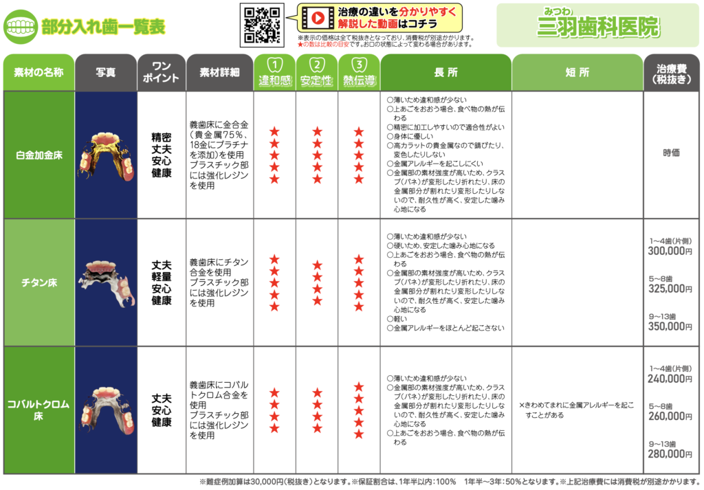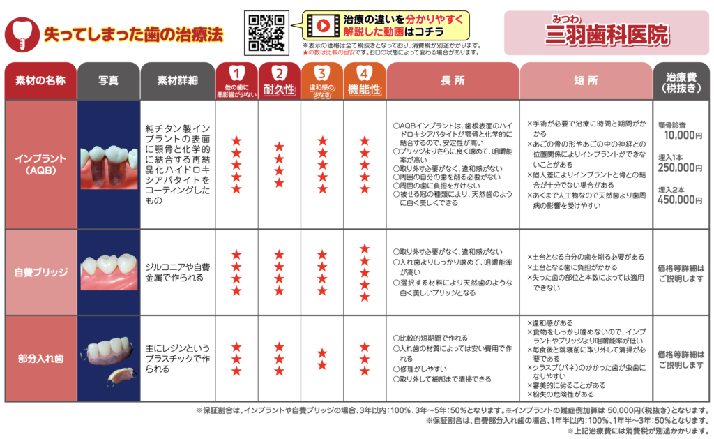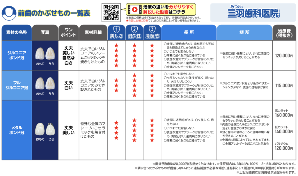 (※下記治療費には消費税が加算されます。治療費:円 / ※昨今の金属の価格高騰により、治療費の額は変動する場合があります。)