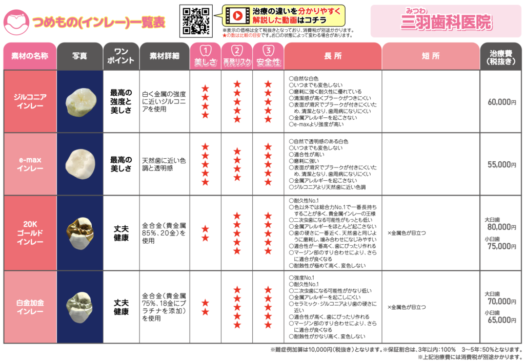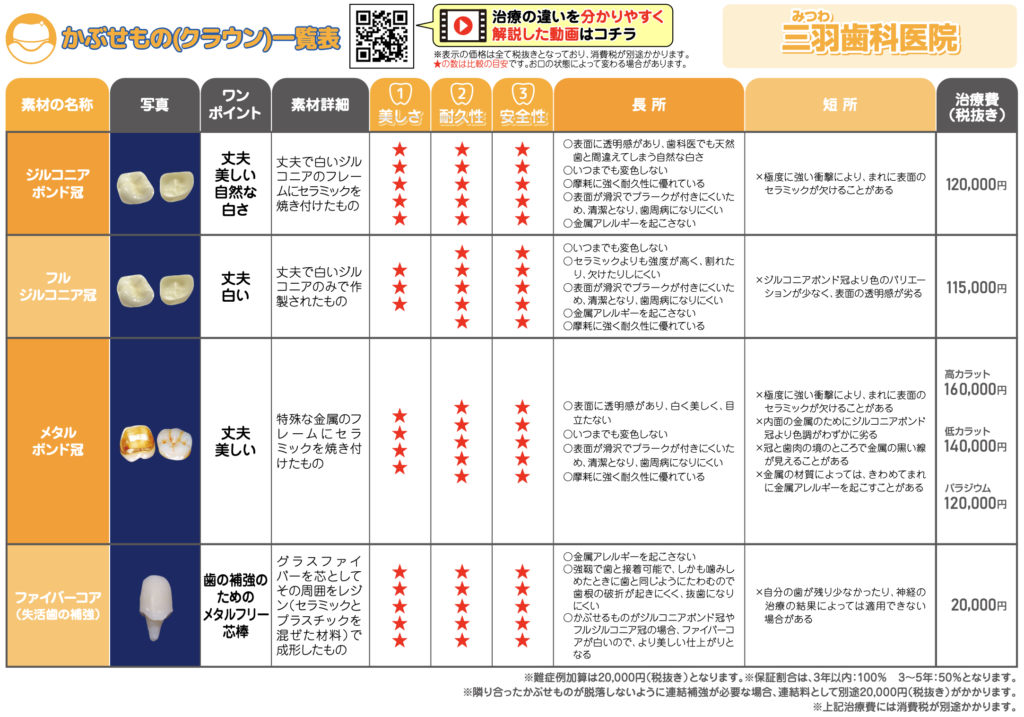 (※下記治療費には消費税が加算されます。治療費:円 / ※昨今の金属の価格高騰により、治療費の額は変動する場合があります。)